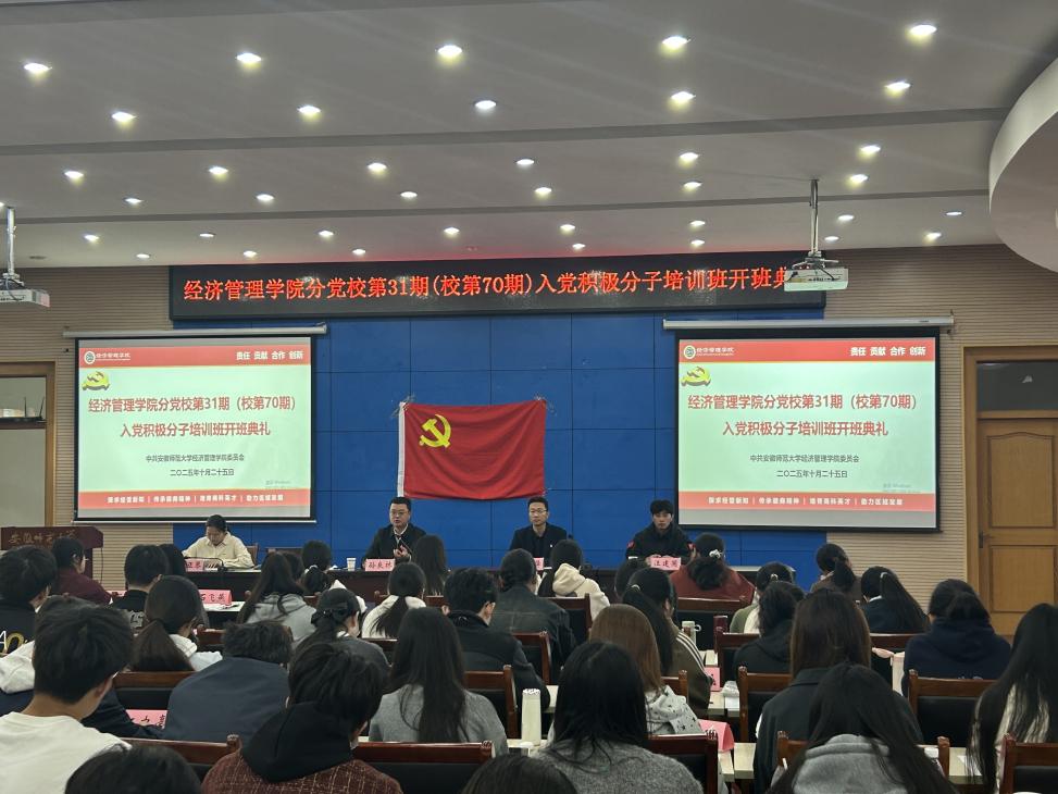 为深入学习贯彻习近平新时代中国特色社会主义思想,加强入党积极分子队伍建设,切实提高政治素养和理论水平,10月25日上午,经济管理学院分党校第31期(校第70期)入党积极分子培训班在会议中心第三报告厅开班。学院党委副书记(主持党委工作)、分党校校长孙良林,学院党委副书记、分党校副校长陈刚锋,培训班班主任汪建国和184名参训学员参加,典礼由分党校班主任盛亚琴主持。