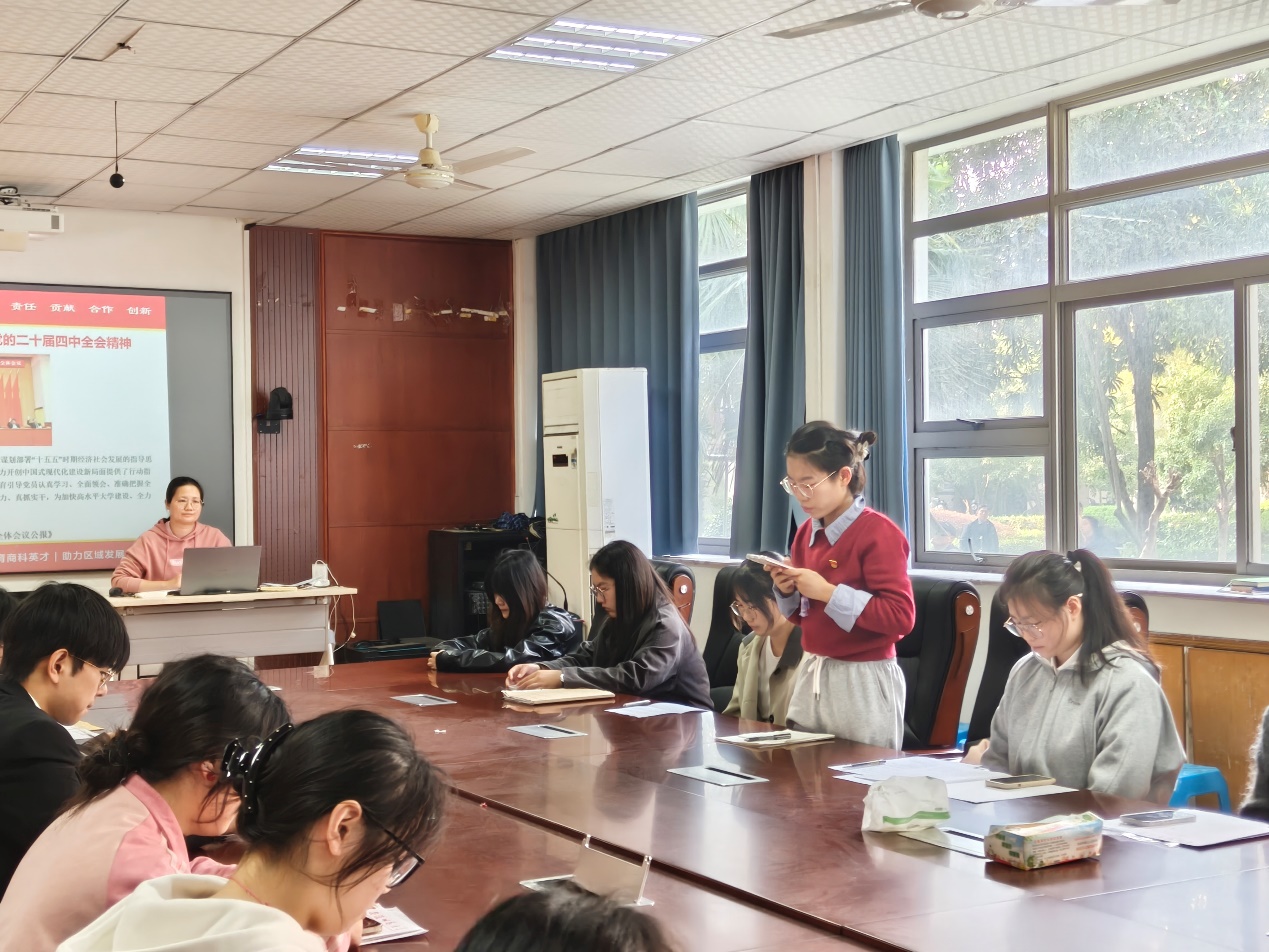 为进一步深化理论武装,凝聚奋进力量,11月14日下午,物流金融本科生党支部于经济管理学院一楼党电中心召开“学习宣传贯彻党的二十届四中全会精神”专题学习党日活动。联系支部的学院党委委员、副院长徐飞应邀出席指导,活动由支部书记盛亚琴主持。