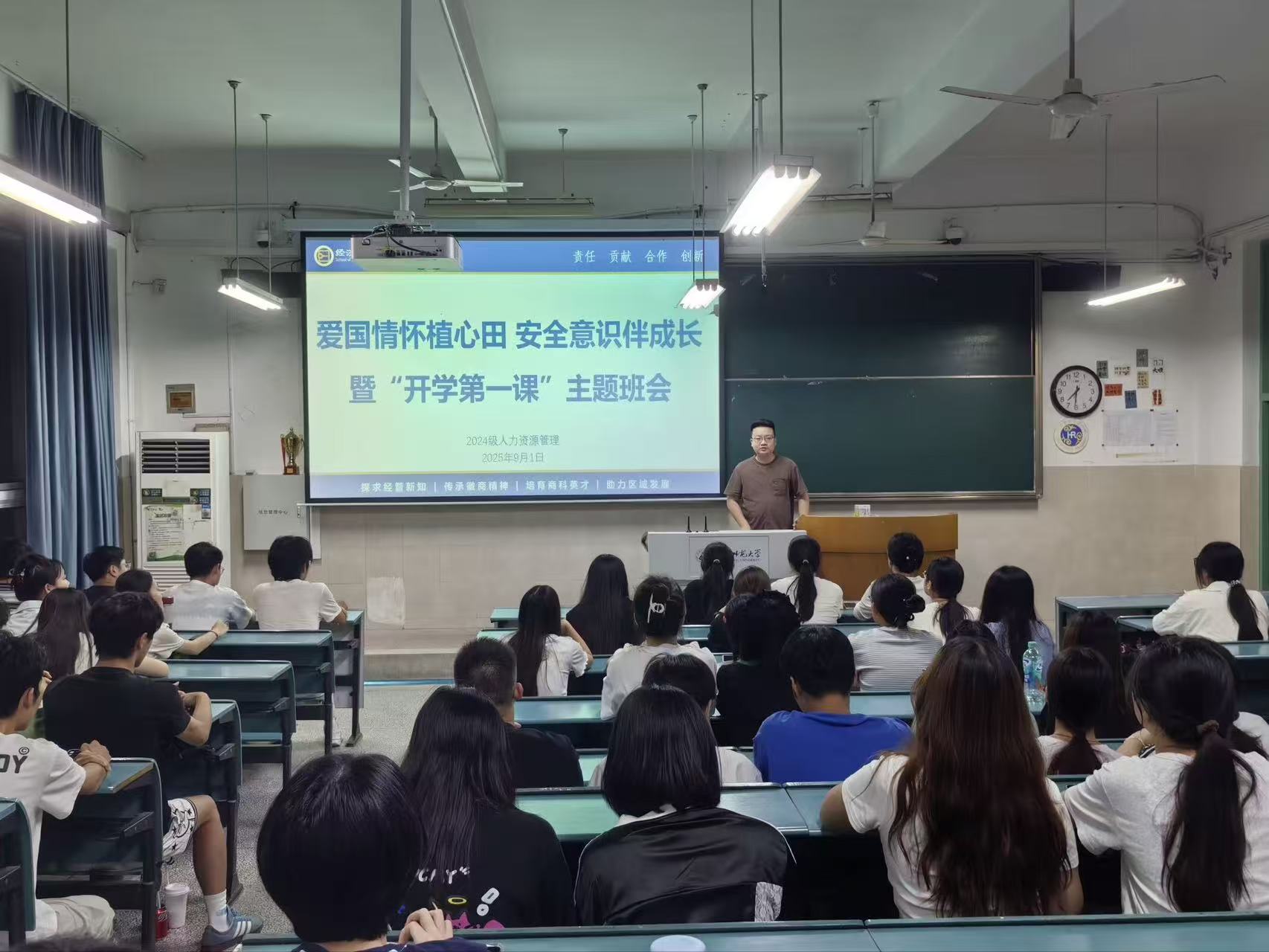 新学期伊始,24级人力资源管理专业开展“开学第一课”主题班会,围绕“爱国情怀植心田,安全意识伴成长”,聚焦大二三大关键转变,提出“必做清单”,引导班级同学明确目标。班会由辅导员刘胡海主持,全体同学参与。
