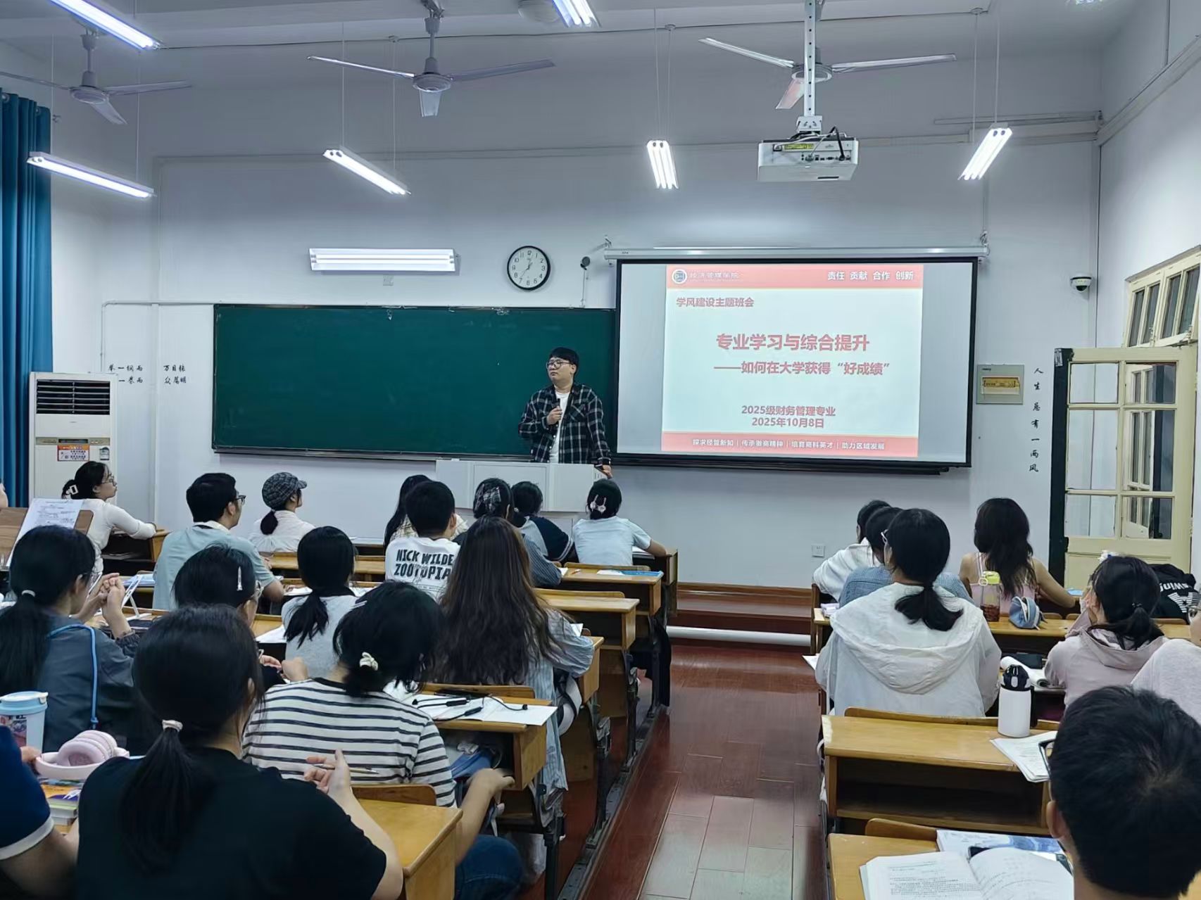 9月26日晚,班级邀请财务管理专业负责人高智林老师、会计专硕学位点负责人汪洋老师、学院财会技能大赛负责老师吕易老师开展专业导航教育。高智林介绍了专业的发展历史、办学情况、师资力量、学科优势及未来发展前景等,详细解读了本专业人才培养方案,深入阐述了课程设置逻辑与毕业要求。汪洋老师介绍了会计专硕的基本情况,围绕专业学习、考研就业等给予学生大学学习成长建议。结合学科特点,吕易重点介绍了财会技能大赛有关情况,鼓励新生以赛促学,提升实践创新能力。