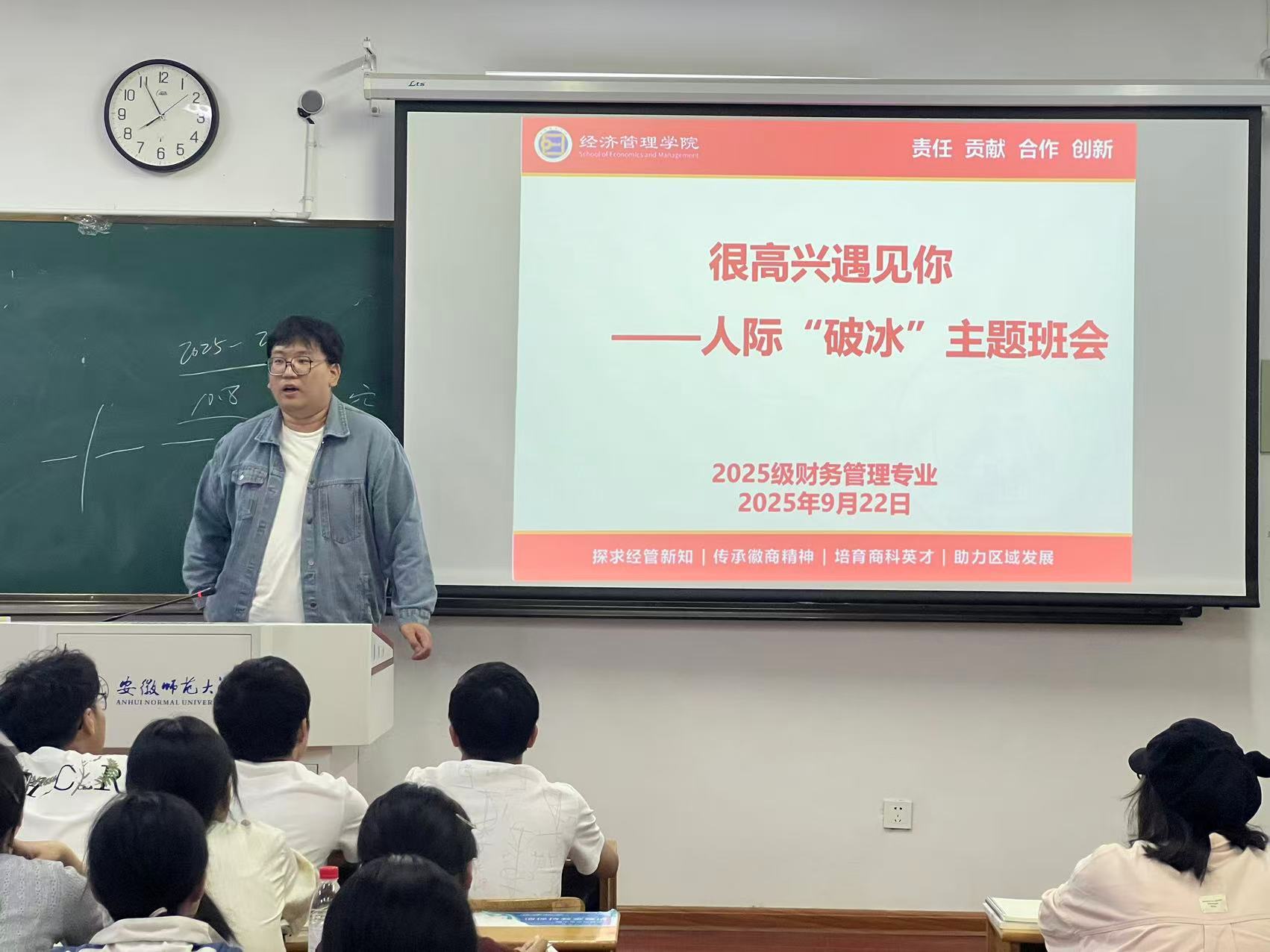 9月20日晚,辅导员吕洋老师围绕“新征程 再成长 共发展”主题召开入学教育主题班会。吕洋首先代表学院向全体新同学表示热烈欢迎,围绕“初识师大、经管”、“安全底线”、“发展高线”和“学习实践”四个主题,详细介绍了学校和学院的基本情况、规章制度以及校园生活。最后,吕洋重点解读了学校家庭经济困难学生资助政策,并对开学初的各项工作进行了安排。本次见面会增进了新生对学院的了解,为他们顺利适应新环境、科学规划大学生活奠定了良好基础。
