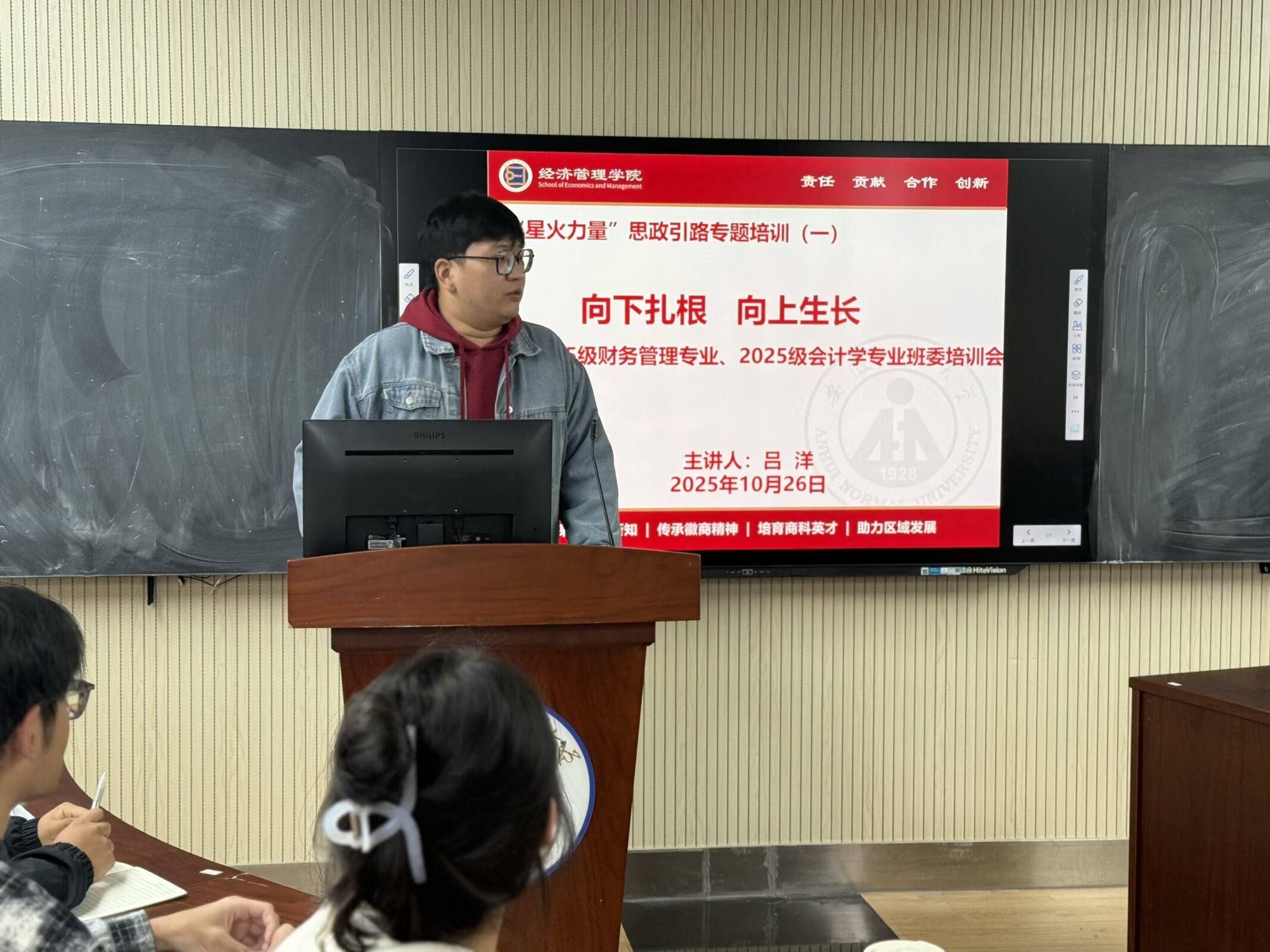 10月26日上午,2025级财务管理专业、2025级会计学专业班委培训会暨“星火力量”思政引路第一讲在赭山校区物理楼508会议室举行。财务管理专业、会计学专业全体班委参加。培训会由辅导员吕洋老师主讲。