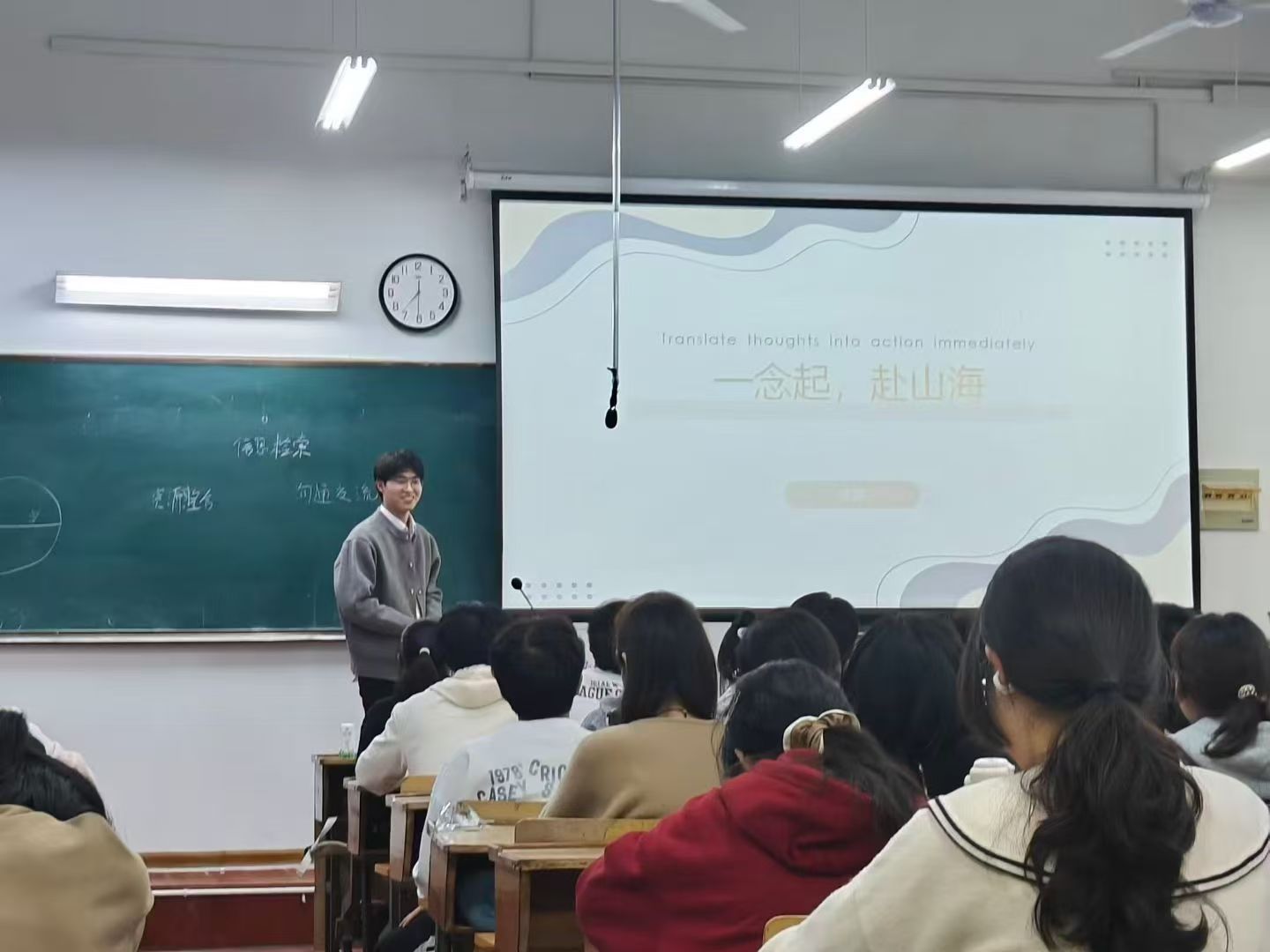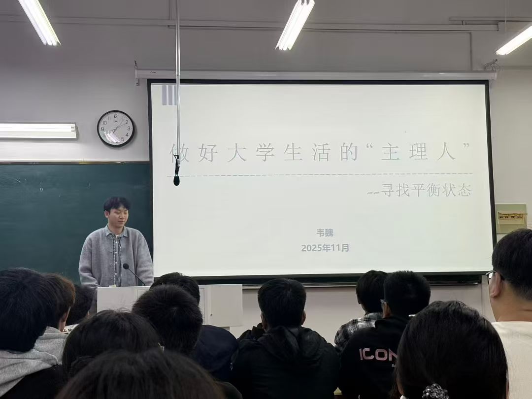 韦魏围绕《做好大学生活的“主理人”》从专业学习、专业实践、综合能力提升等角度分析了如何寻找平衡状态,勉励学弟学妹保持积极向上乐观的心态,学好专业课,主动参加各类实践活动,不断提升自己的综合素养。马跃围绕《一念起,赴山海》分享了自己在职场生活的感受与体验,从职业素养要求出发回望大学应该提升的综合能力,勉励学弟学妹重视综合素养的提升。
