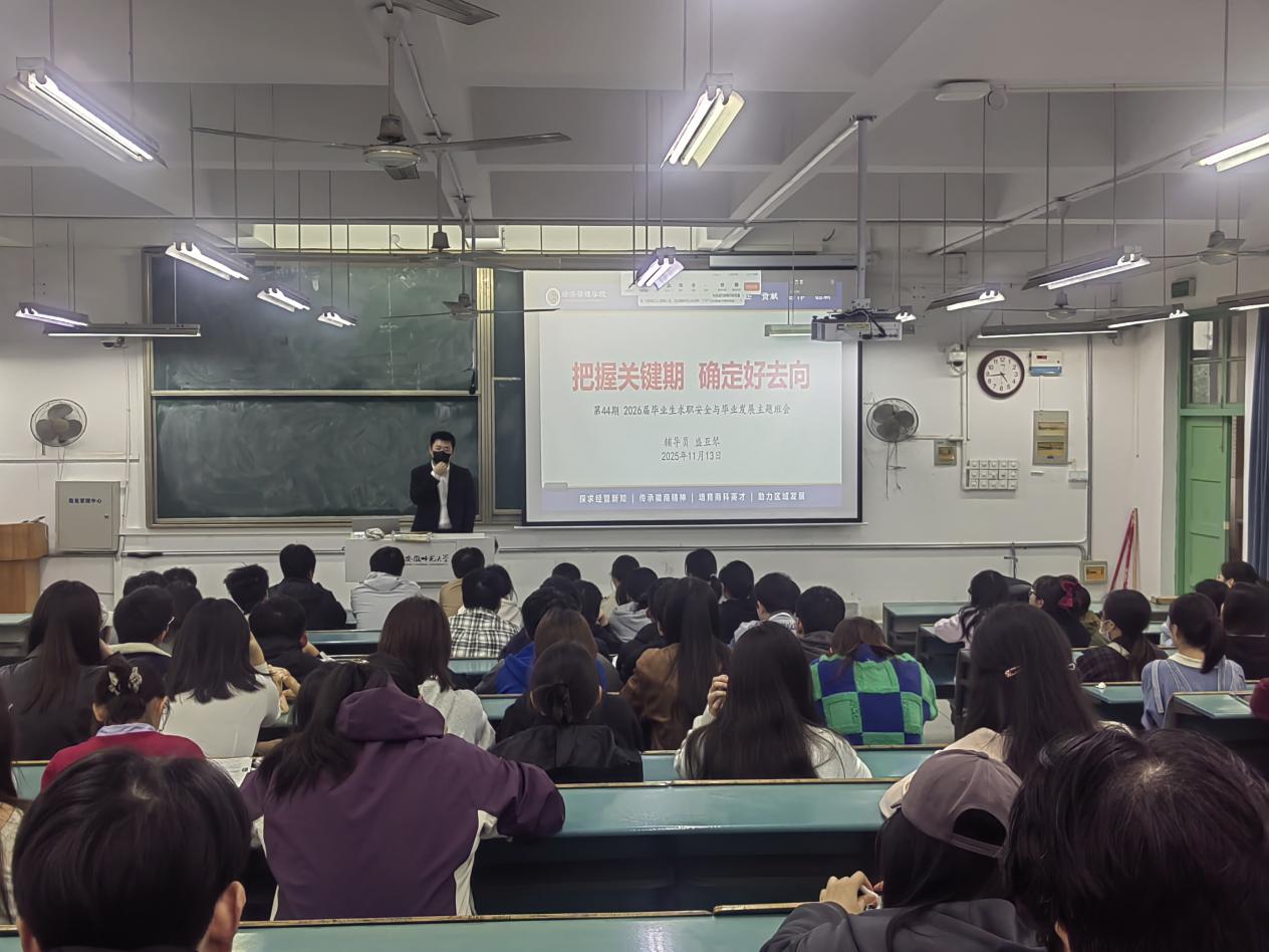 为帮助2026届毕业生理清就业形势,明确发展方向,11月13日下午,2022级会计学、人力资源管理和供应链管理专业在2070301教室开展“把握关键期 确定好去向”毕业生求职安全与毕业发展主题班会。班会由辅导员盛亚琴主持,人力资源管理专业系主任鲍子如受邀参会。