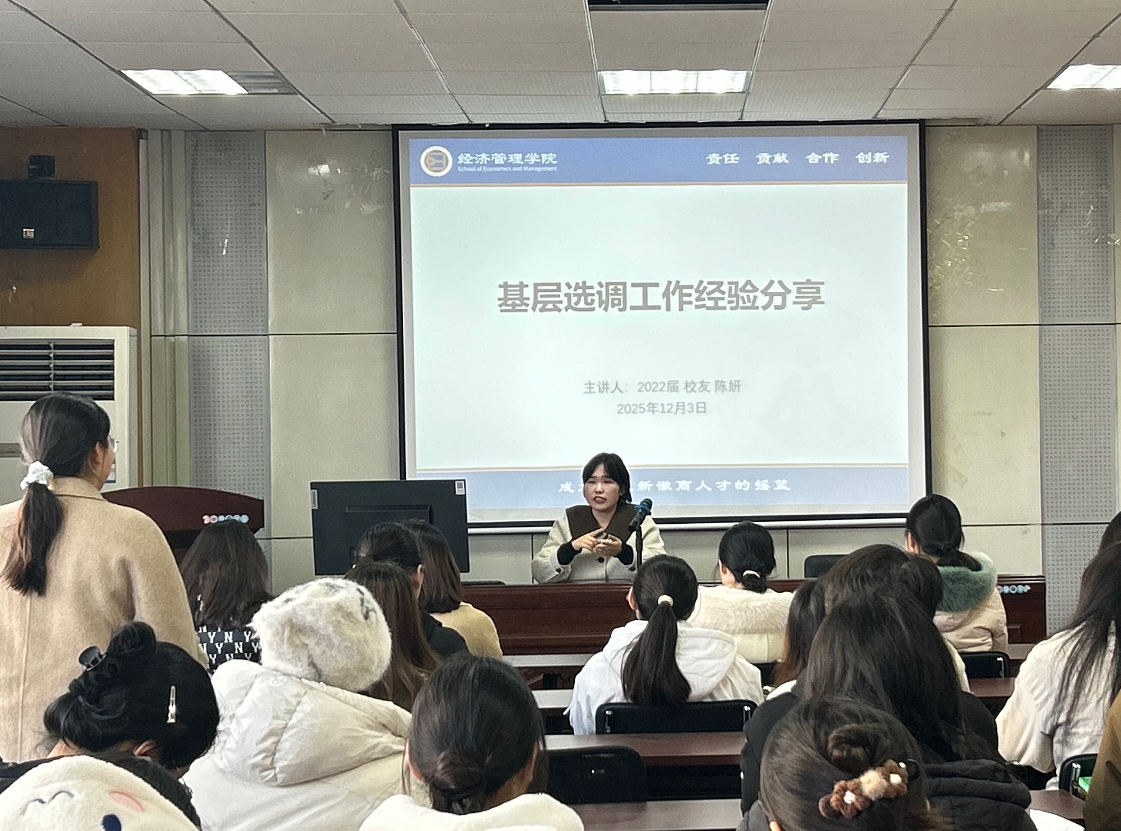 12月3日下午,经济管理学院在二楼会议室举办选调生经验分享会。活动邀请学院2022届会计学ACCA校陈妍返校交流,分享会由2023级辅导员付擎主持。