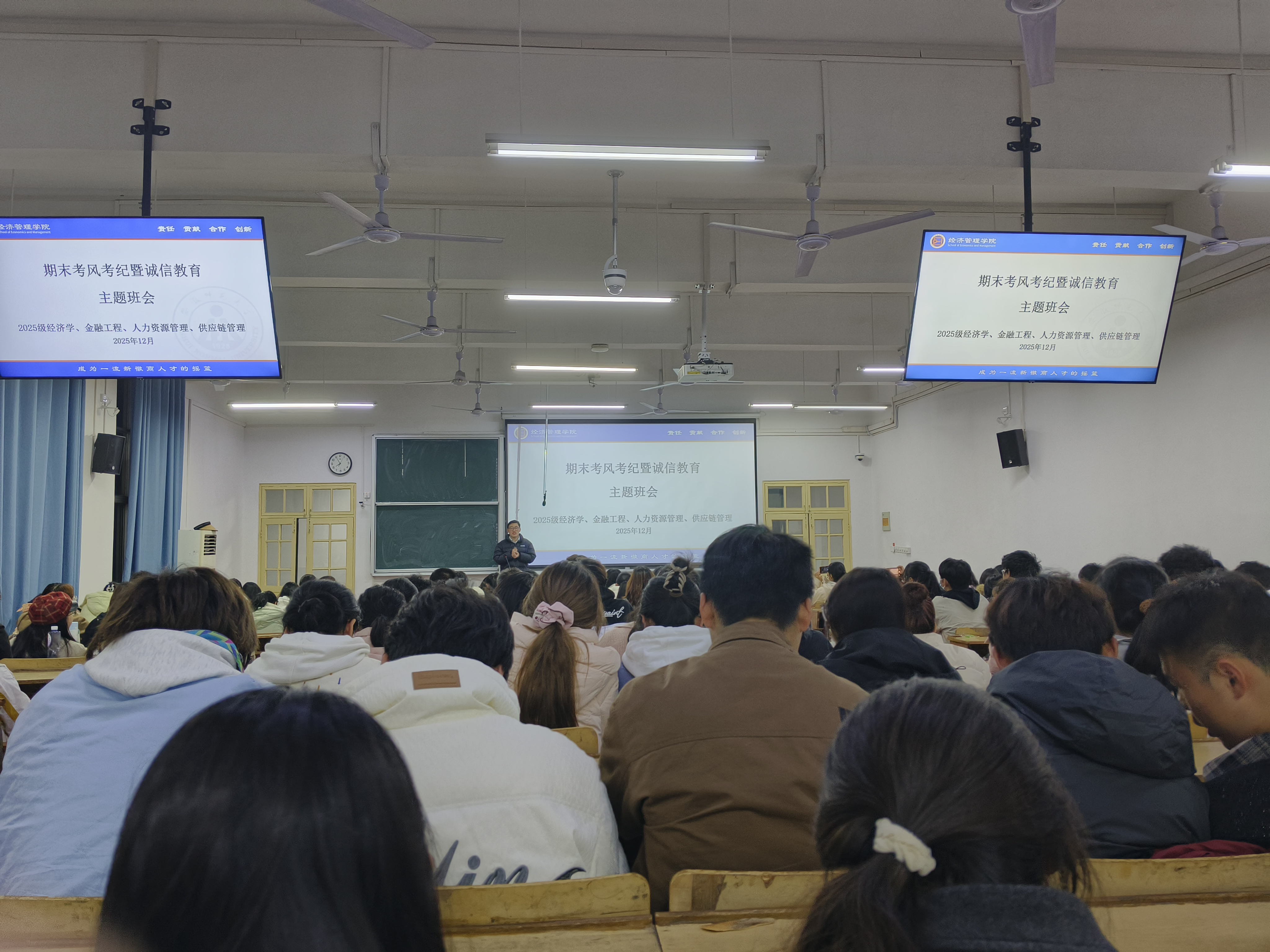 为严肃考试纪律,营造公平公正的考试环境,强化学生的诚信意识和规矩意识,12月10日晚上,经济管理学院2025级经济学、金融工程、人力资源管理、供应链管理专业召开期末考风考纪暨诚信教育主题班会。班会由辅导员张晨主持。