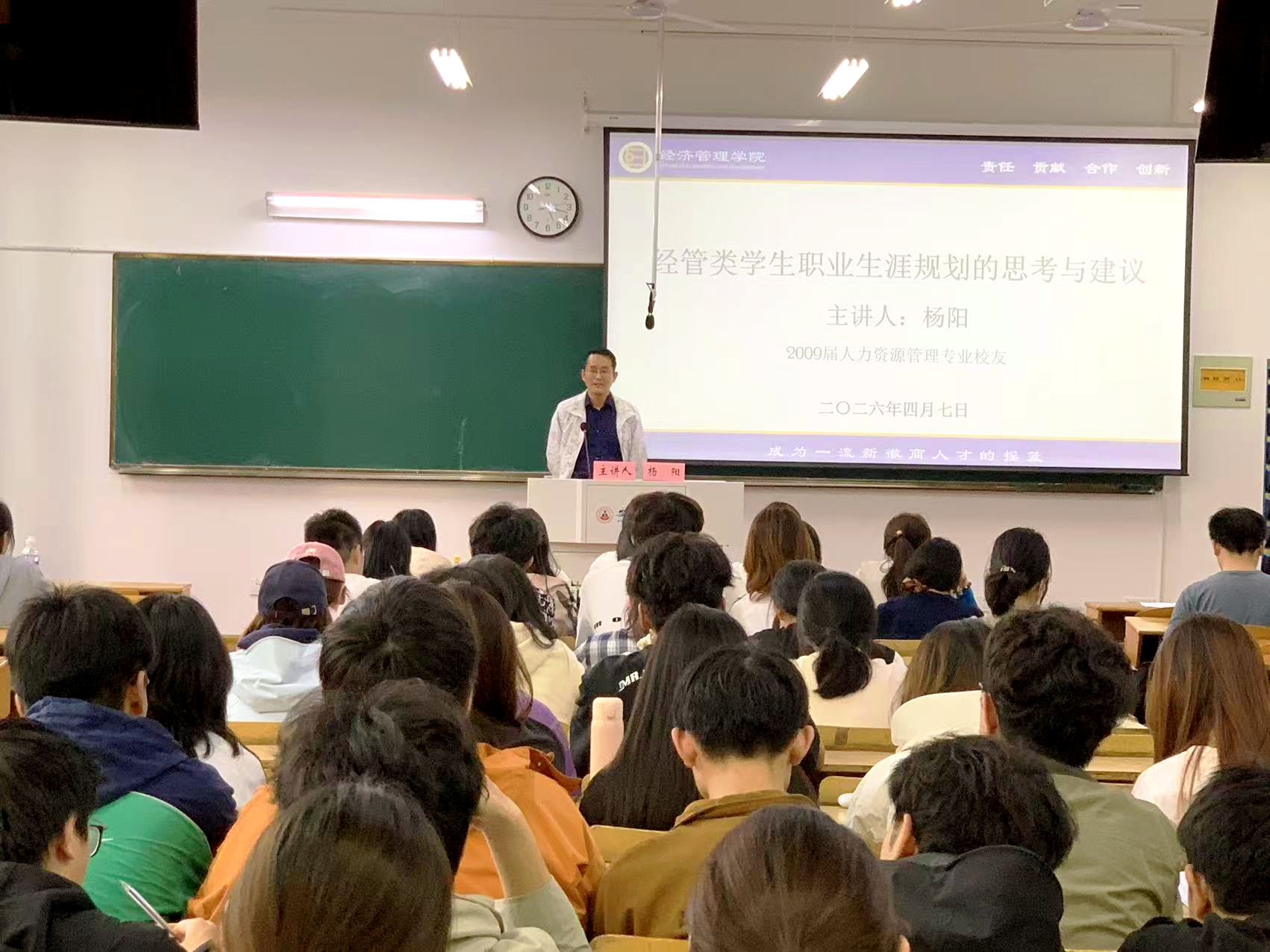 为帮助学生明晰职业发展方向,科学规划大学生涯,4月7日,经济管理学院在赭山校区举办“经管类学生职业生涯规划的思考与建议”主题分享会。特邀2009届人力资源管理专业校友杨阳担任主讲,院长马长伟、辅导员张晨及各专业学生代表参加活动。
