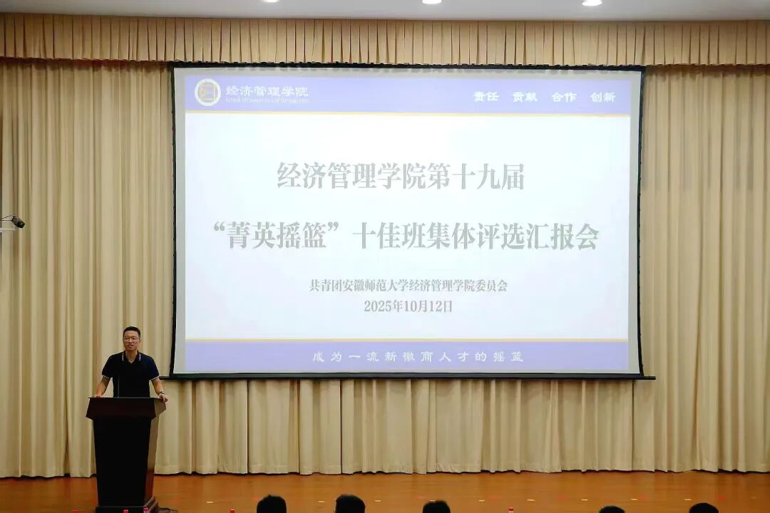 为进一步发挥班集体在“立德树人”中的重要作用,推动优良院风、班风、学风建设,10月12日晚19:30,经济管理学院在赭山校区科技南楼报告厅举行第十九届“菁英摇篮”十佳班集体评选活动。院党委副书记陈刚锋、财会系主任孙丽、经济系主任陈龙、数字经济系主任孔敏、金融工程系主任陈超、人力资源管理系主任鲍子如、院团委书记吕洋、全体专兼职辅导员和全体2025级本科新生参加。评选汇报会由第22届团委、学生会部长韦凯翔主持。