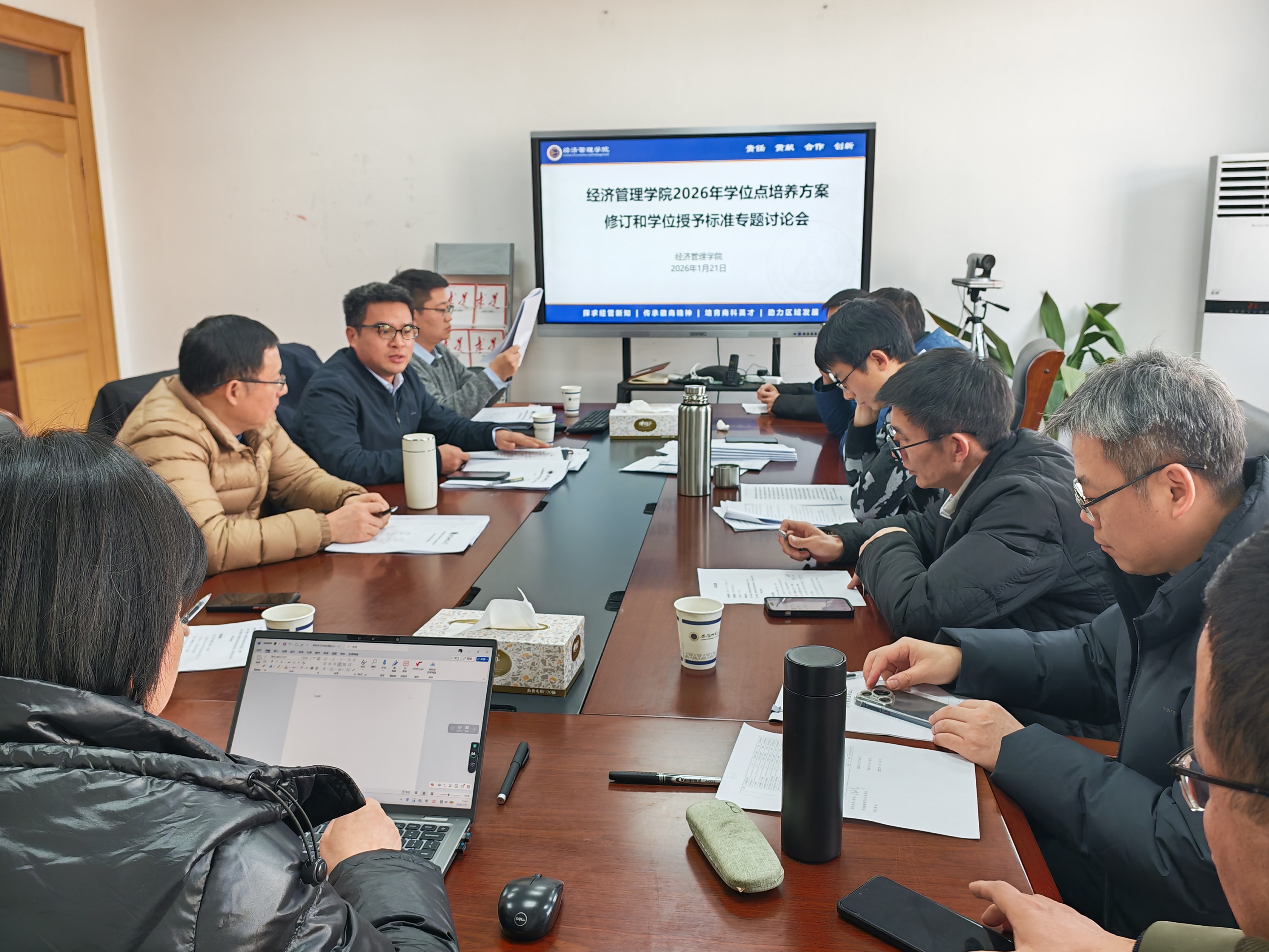 1 月 21 日下午,经济管理学院在学院四楼会议室召开2026 年学位点培养方案修订与学位授予标准专题讨论会。研究生院副院长韩玉刚、副院长徐飞,各学位点负责人,硕士研究生导师代表参加会议,会议由院长马长伟主持。