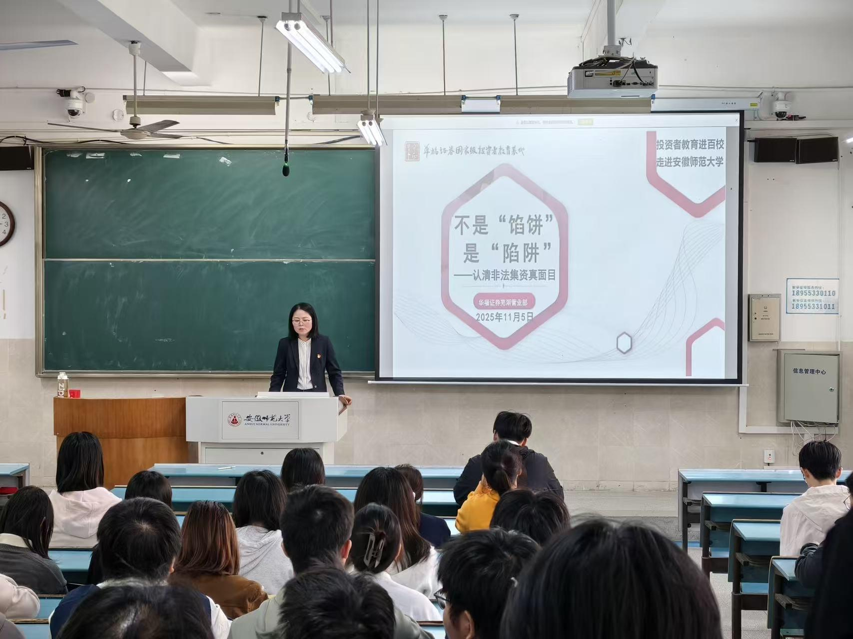 为提升师生金融风险防范意识,11月5日下午,2023级、2024级金融工程专业在花津校区1号楼309教室进行“不是馅饼是陷阱:认清非法集资真面目”主题讲座。本次讲座由华福证券芜湖营业部合规风控经理齐春艳担任主讲人,70余名同学参与讲座交流。