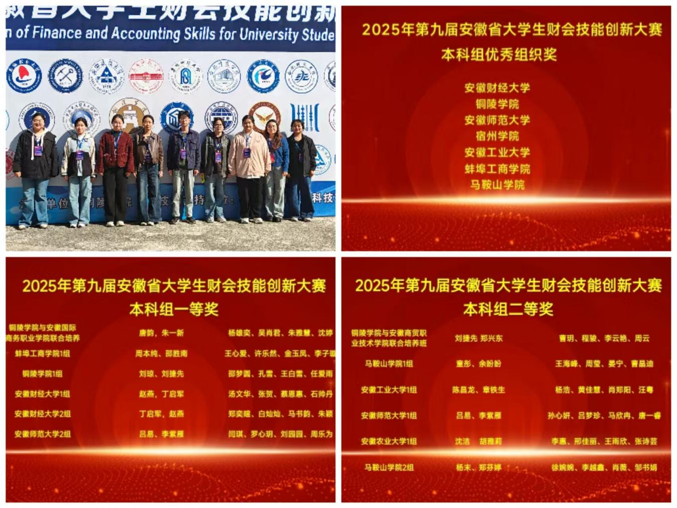 11月15日,由安徽省教育厅主办的第九届安徽省大学生财会技能创新大赛圆满落幕,我校经济管理学院选派的两支本科生代表队表现优异,分别荣获一等奖和二等奖,学校荣获“优秀组织奖”。
