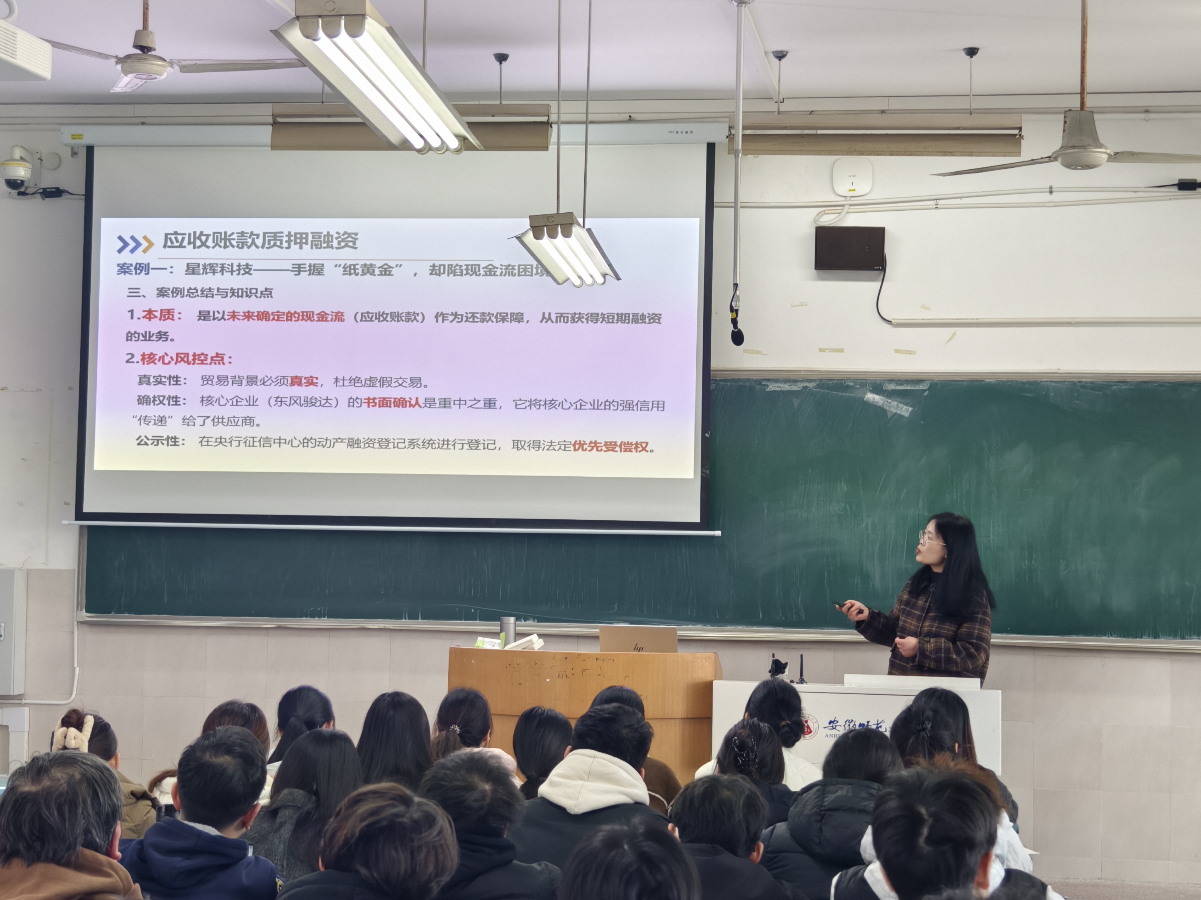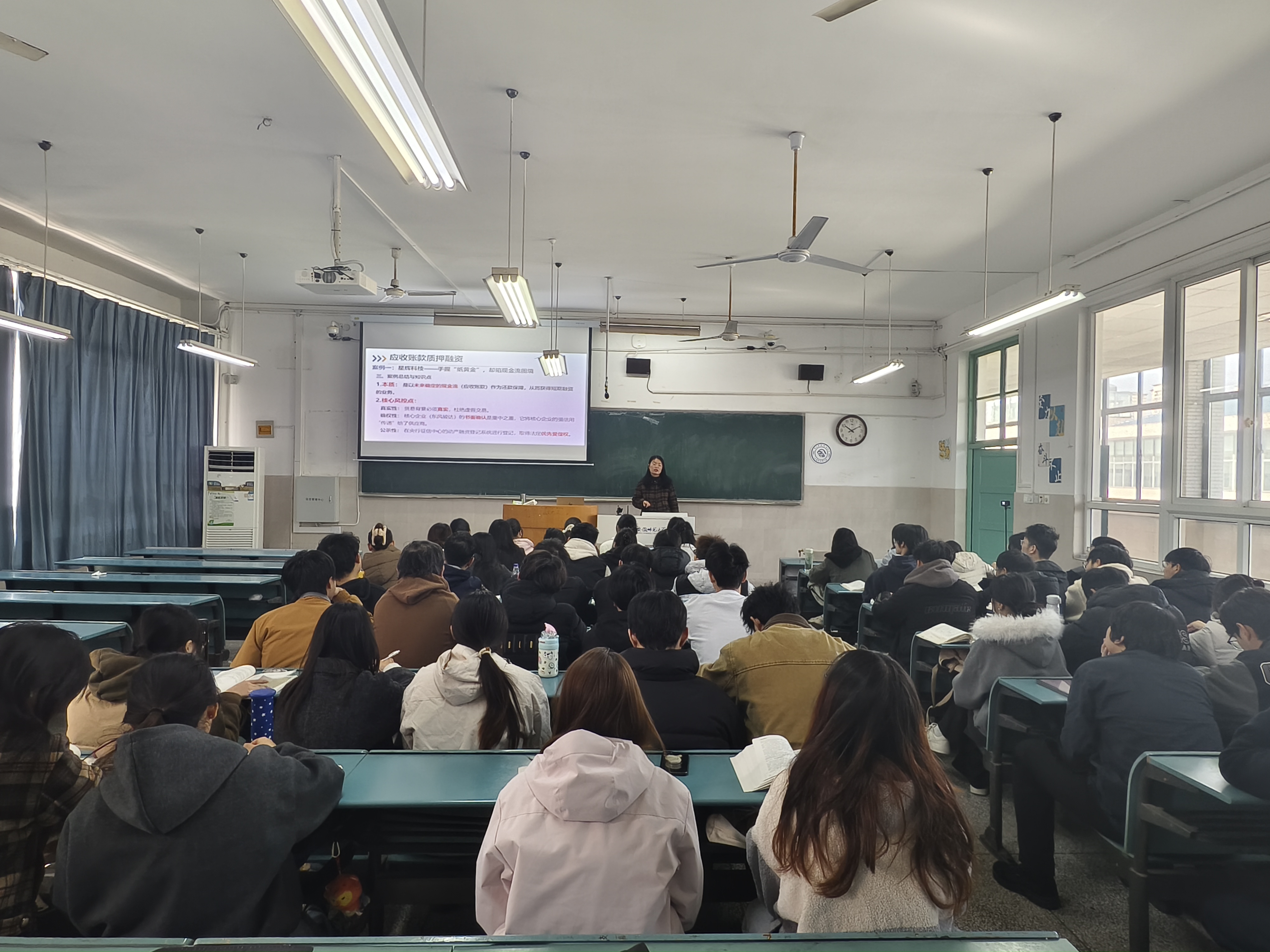 于案例分析中见精神,传递责任担当与创新意识。在后续的案例串联中,从“卓越零部件”的动态循环质押,到“星辰新能源”的应收账款循环转让,再到“擎天重工”主导的反向保理平台,郭老师层层递进,引导学生不仅理解不同融资模式的操作流程与风控逻辑,更深入思考其背后的战略意义。她特别强调,核心企业主动搭建金融平台帮扶供应商,并非“多此一举”,而是将其信用优势转化为产业链整体竞争力的“高明之举”,体现了现代企业从“竞争”走向“竞合”、从“独赢”迈向“共赢”的战略远见与社会责任感。