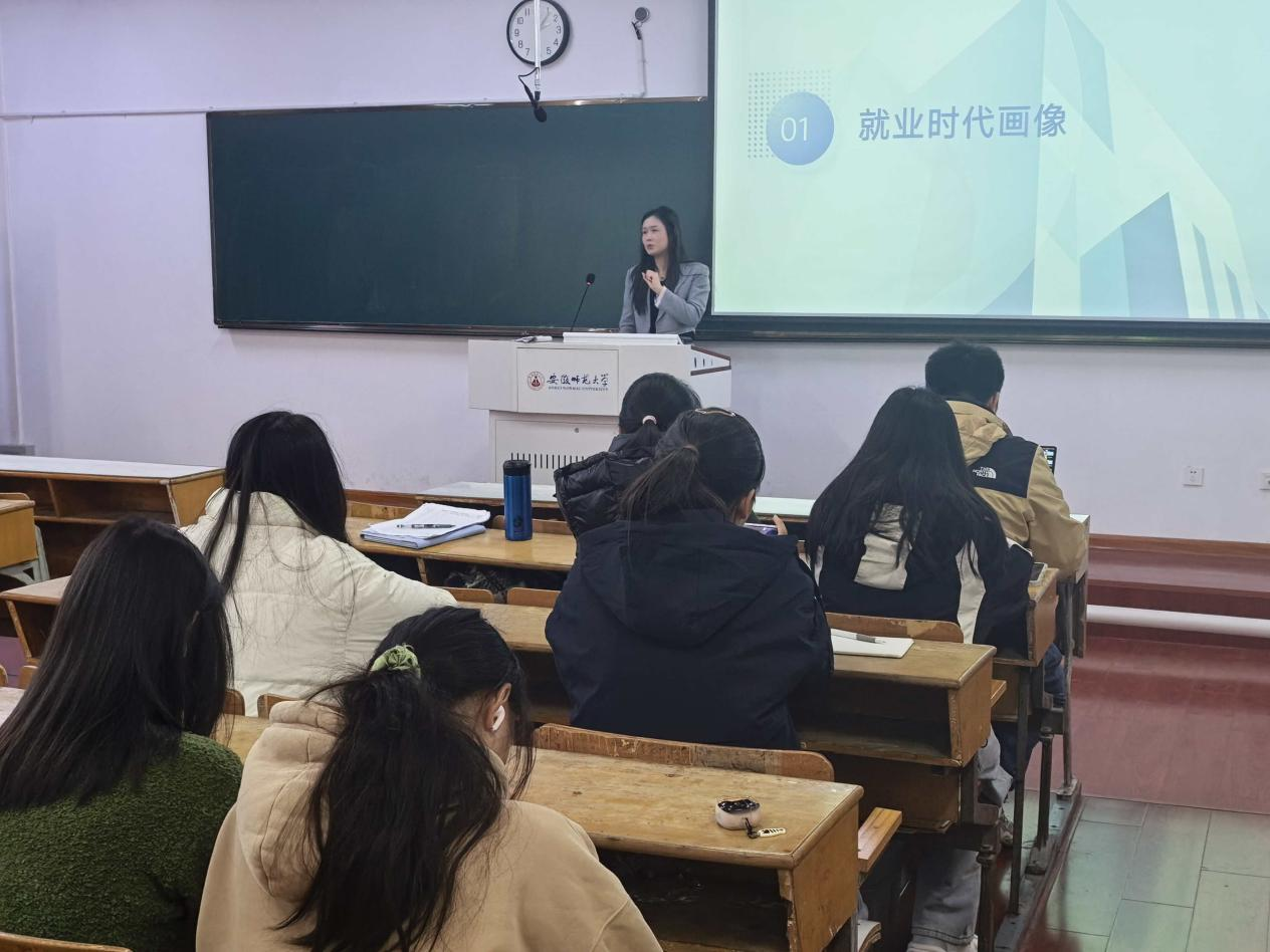 为助力学生全面提升综合素养、拓宽专业认知边界,促进理论知识与实践应用深度融合,11月19日下午,人力资源管理系系主任鲍子如老师邀请科锐国际芜湖分公司负责人马婷走进人力资源管理专业课堂,开展主题为《从校园到职场成为企业争抢的未来之星》的专业讲座。讲座由人力资源管理系系主任鲍子如老师主持,25级人力资源管理专业全体本科生参加讲座。