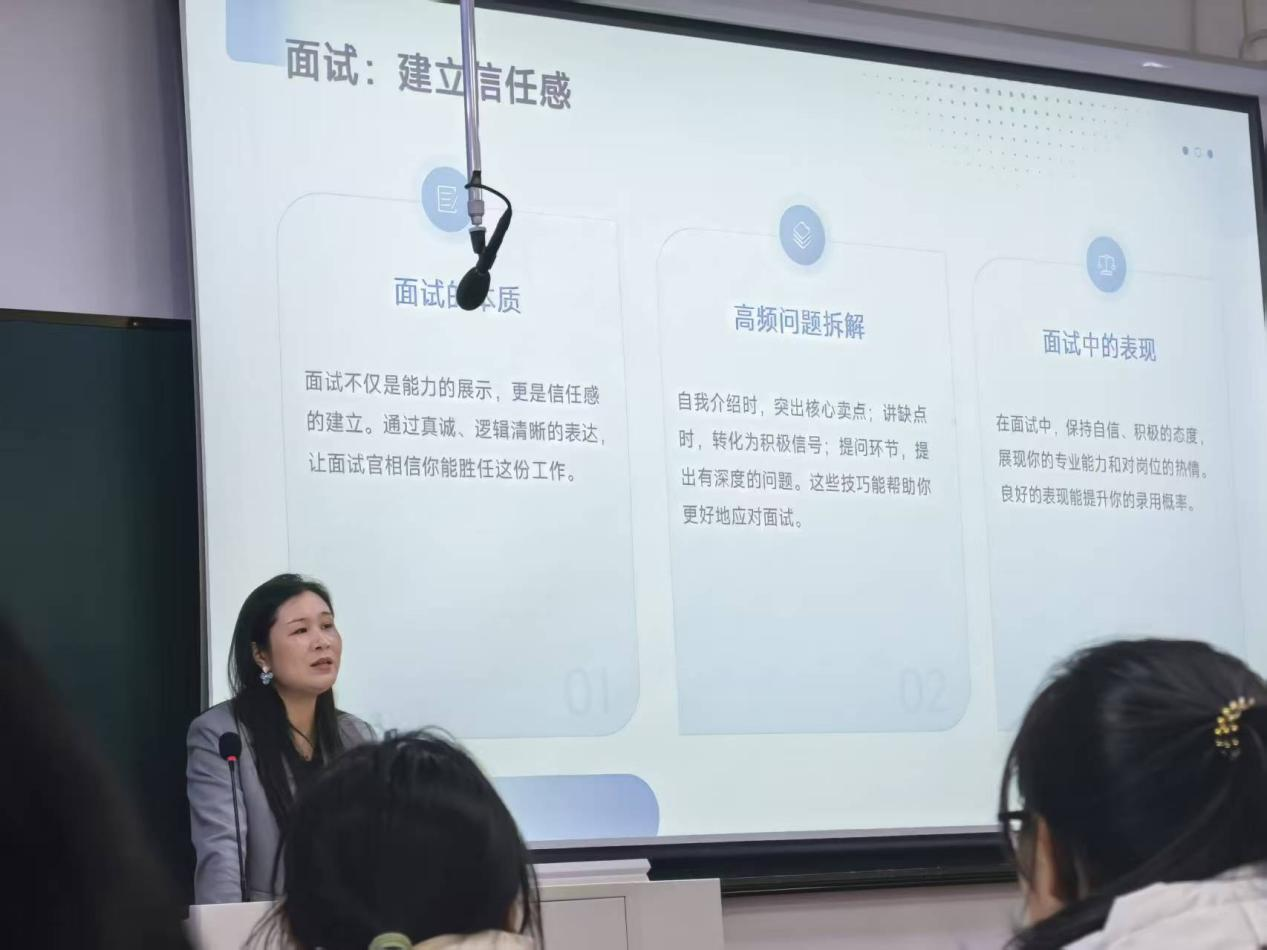 马婷老师围绕求职与职场适应展开干货分享,为在场学生带来从自我定位到职场进阶的全流程指导。分享中,马婷老师从“知己”出发,讲解如何用SWOT分析法和兴趣-能力矩阵梳理个人优势;在“知彼”环节,指导学生通过研究行业趋势、解读岗位需求精准匹配目标;实操层面,她详解了STAR法则写简历、面试建立信任感等技巧,并点明猎头眼中的求职“红绿灯”以规避雷区。针对职场适应,她强调软技能是胜负手,鼓励大家以“不完美也能成战士”的心态,在职业马拉松中保持学习力与长期视角,帮助学生清晰掌握了从求职到入职的关键方法。