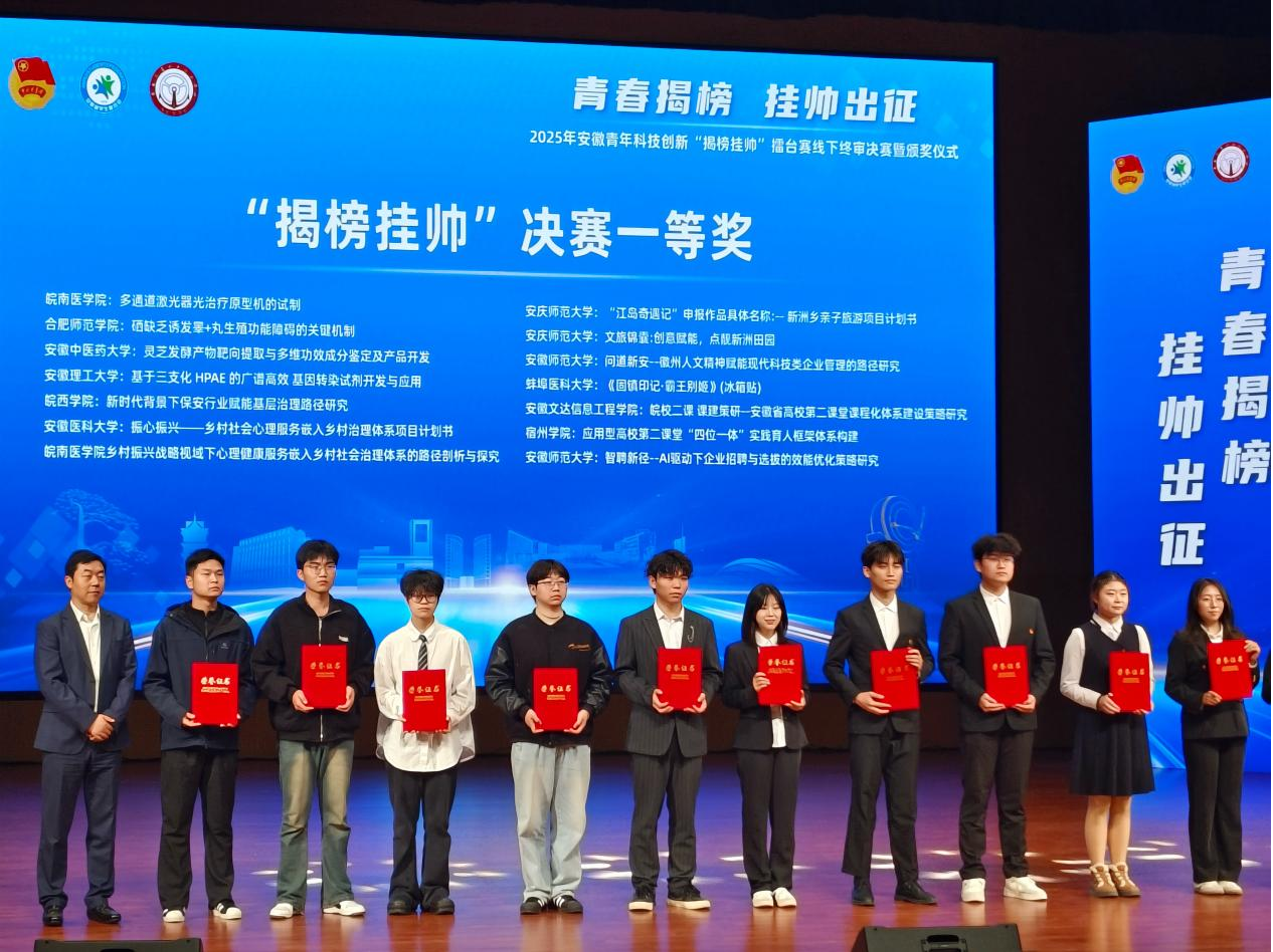近日,2025年度安徽青年科技创新“揭榜挂帅”擂台赛在安徽交通职业技术学院落下帷幕。由我校经济管理学院人力资源管理系主任鲍子如老师、副院长徐飞老师与人力资源管理专业负责人何建华老师指导,潘紫晴、杨颖彬、张悦悦等十名2023级人力资源管理专业本科生组成的学生团队,在面向安徽省内高校学生“发榜”的80项省级榜题,共344支参赛队伍的激烈竞争中脱颖而出,最终荣获“揭榜挂帅”决赛一等奖。