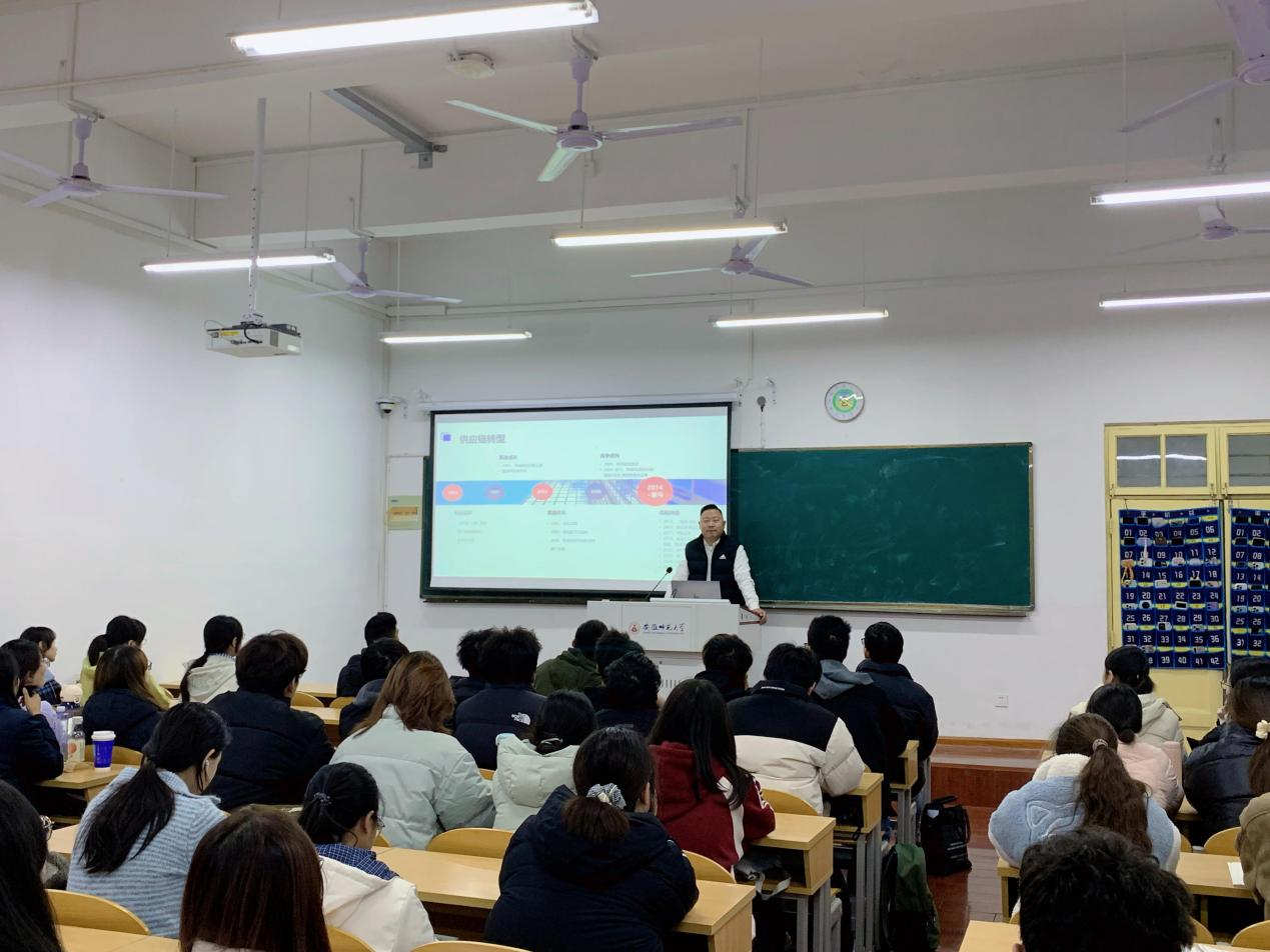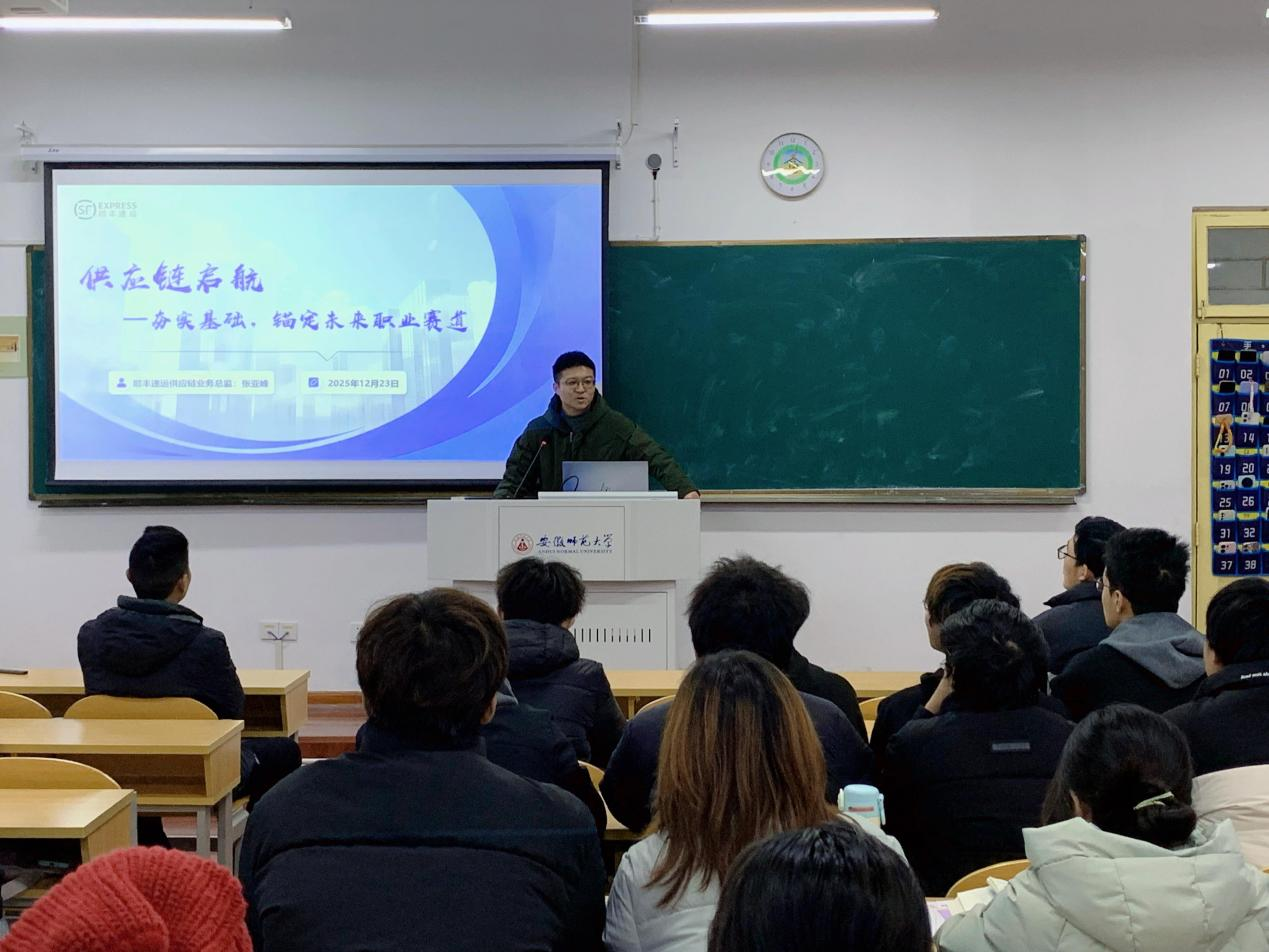 为帮助新生筑牢专业认知根基,明晰行业发展脉络,12月23日下午4点,安徽师范大学经管学院25级供应链管理专业邀请行业专家走进学科与专业导论课堂。本次活动由供应链管理专业系主任方昶老师主持,安徽顺丰供应链总监张亚峰受邀担任主讲嘉宾,25级供应链管理专业全体新生及辅导员张晨老师全程参与。