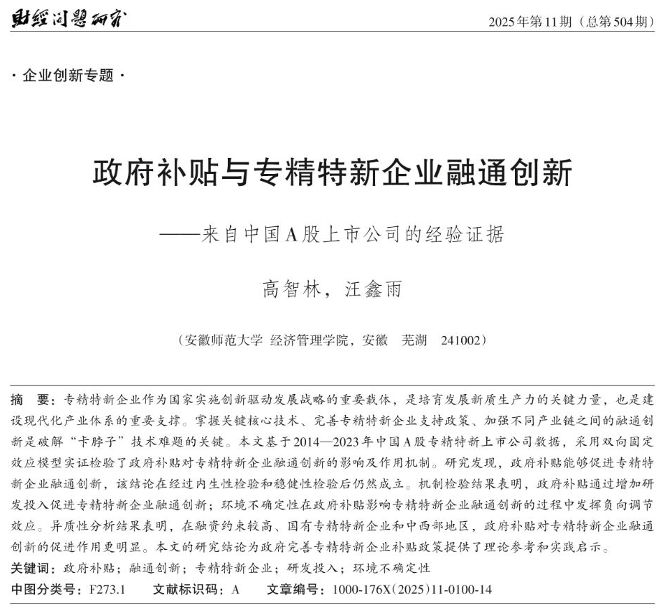 近日,经济管理学院2024级工商管理学硕士研究生汪鑫雨与导师高智林副教授合作,在财经类权威期刊《财经问题研究》2025年第11期发表题为“政府补贴与专精特新企业融通创新——来自中国A股上市公司的经验证据”的学术论文。论文以安徽师范大学经济管理学院为唯一署名单位,标志着学院学术型硕士研究生培养质量再上新台阶,也是学院近年来实施“振兴行动计划”科研育人取得的又一标志性成果。