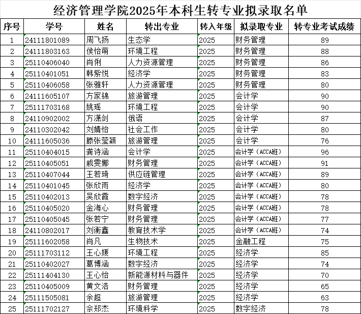 现将经济管理学院2025年本科生转专业拟录取名单予以公示,公示时间2025年12月25日-2025年12月30日。 如有异议,请拨打电话: 0553-5910546,联系人:张老师(学院教学办); 0553-5910549,联系人:彭老师(学院纪委)。